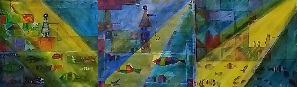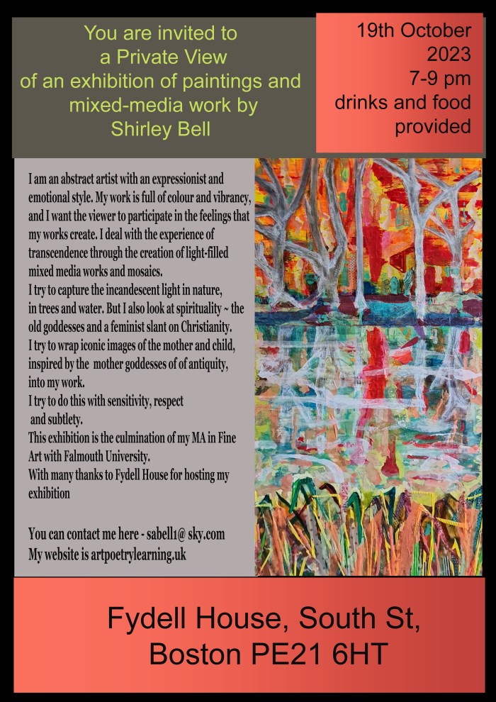 I will exhibit works and produce an art book*, with the title and cover below (in progress). I am debating how to combine my abstract landscapes with my abstracts on The Stations of the Cross, The Annunciation, etc – perhaps hanging them in separate rooms at Fydell House.